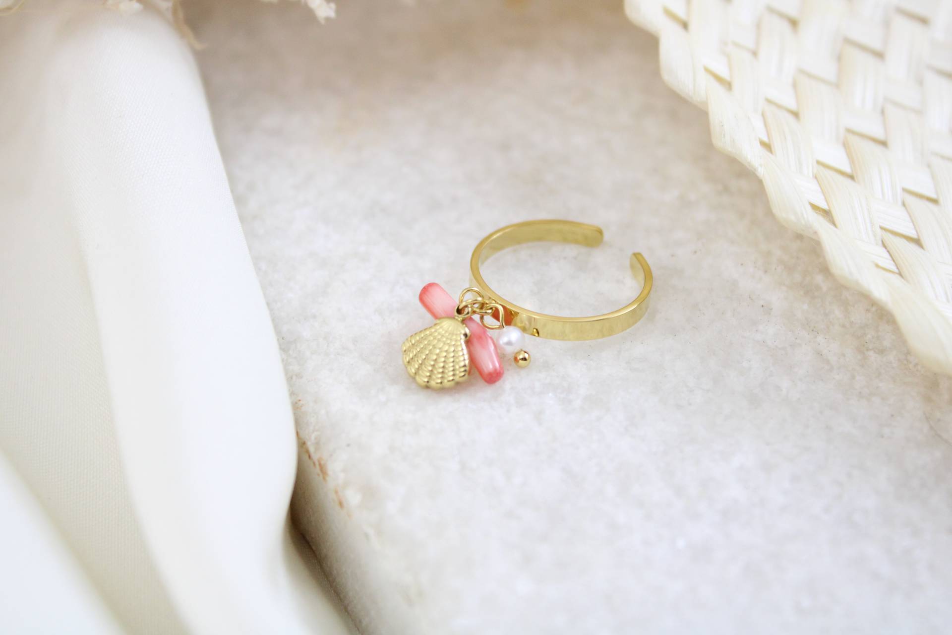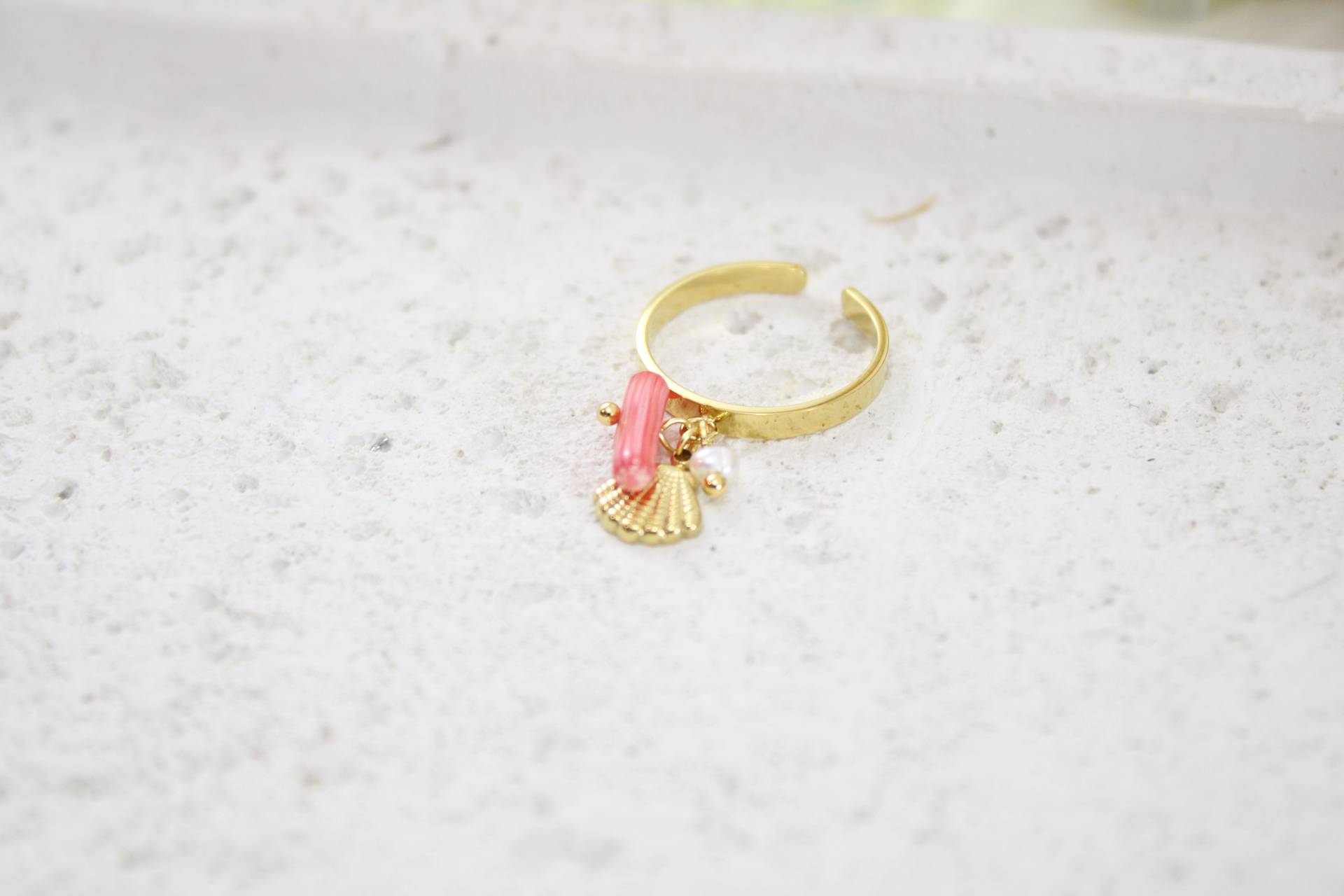 טבעת בשילוב צדף אבן ורודה ופנינה חומר גלם: סטיינלס סטיל בציפוי זהב