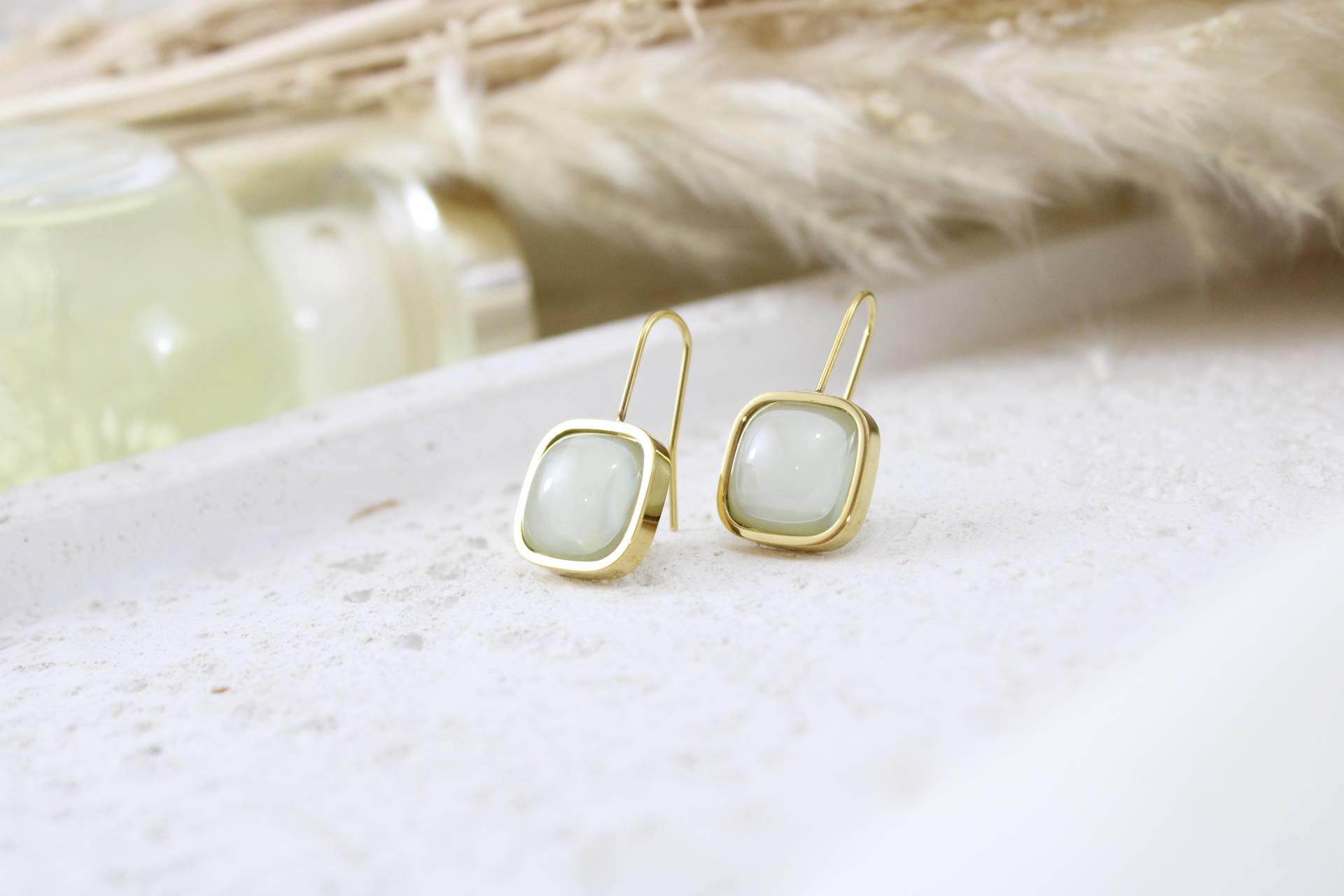 עגילים בשילוב אבן ירוק בהיר גדולה חומר גלם: סטיינלס סטיל בציפוי זהב