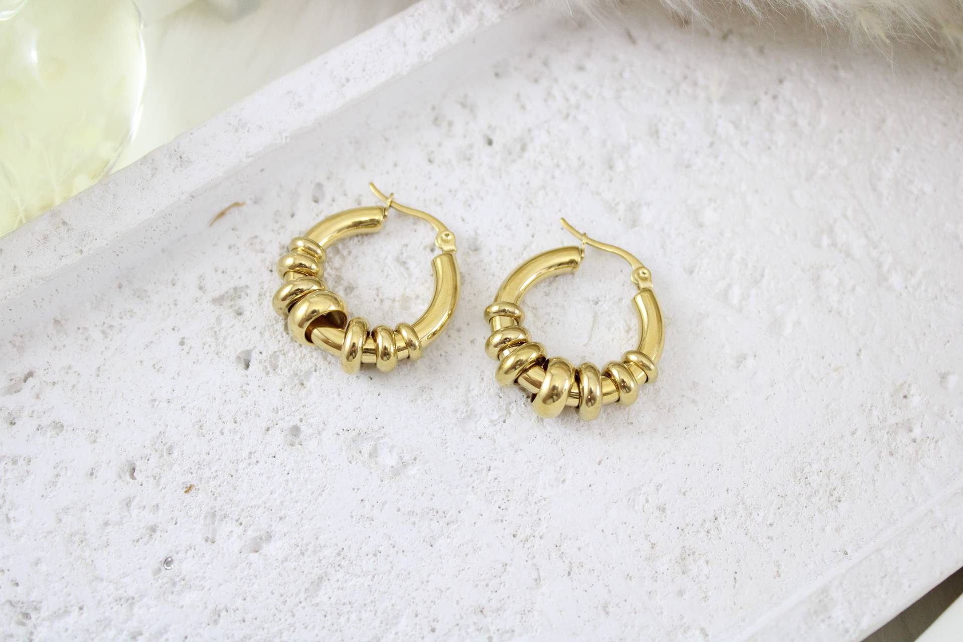 עגילי חישוק עבים בינוניים בשילוב אלמנטים בציפוי זהב חומר גלם: סטיינלס סטיל בציפוי זהב