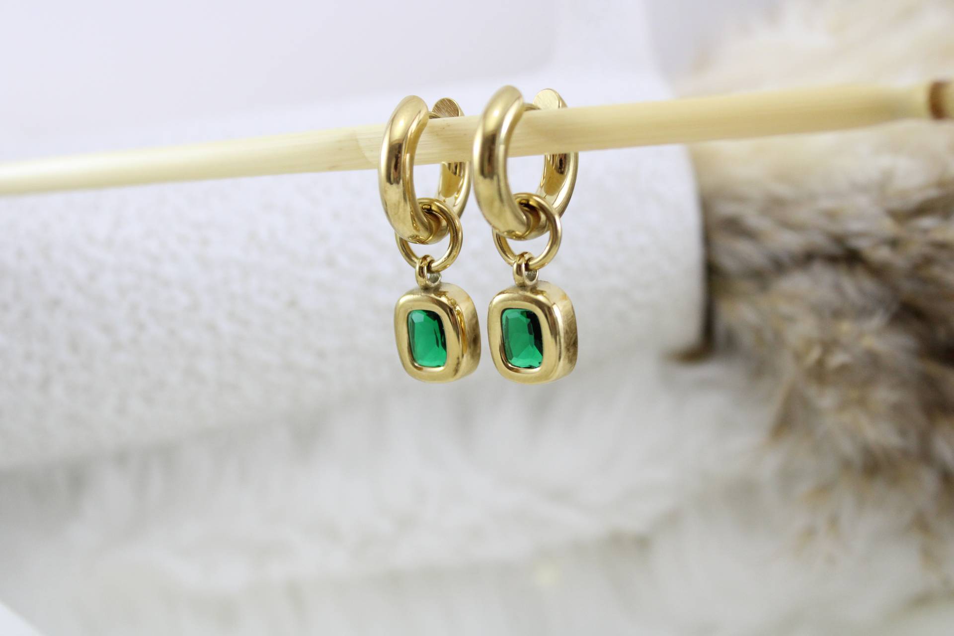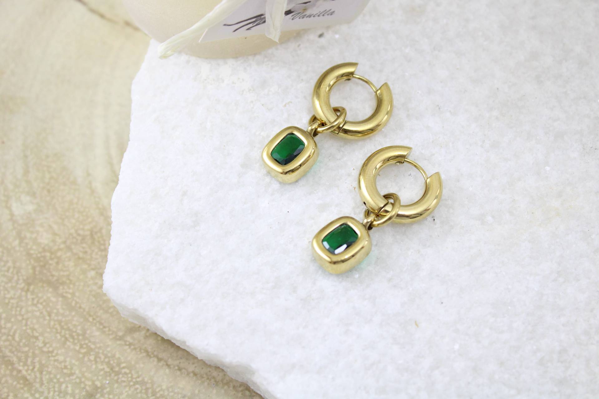 עגילי חישוק עבים בשילוב אבן ירוקה חומר גלם סטיילס סטיל בציפוי זהב