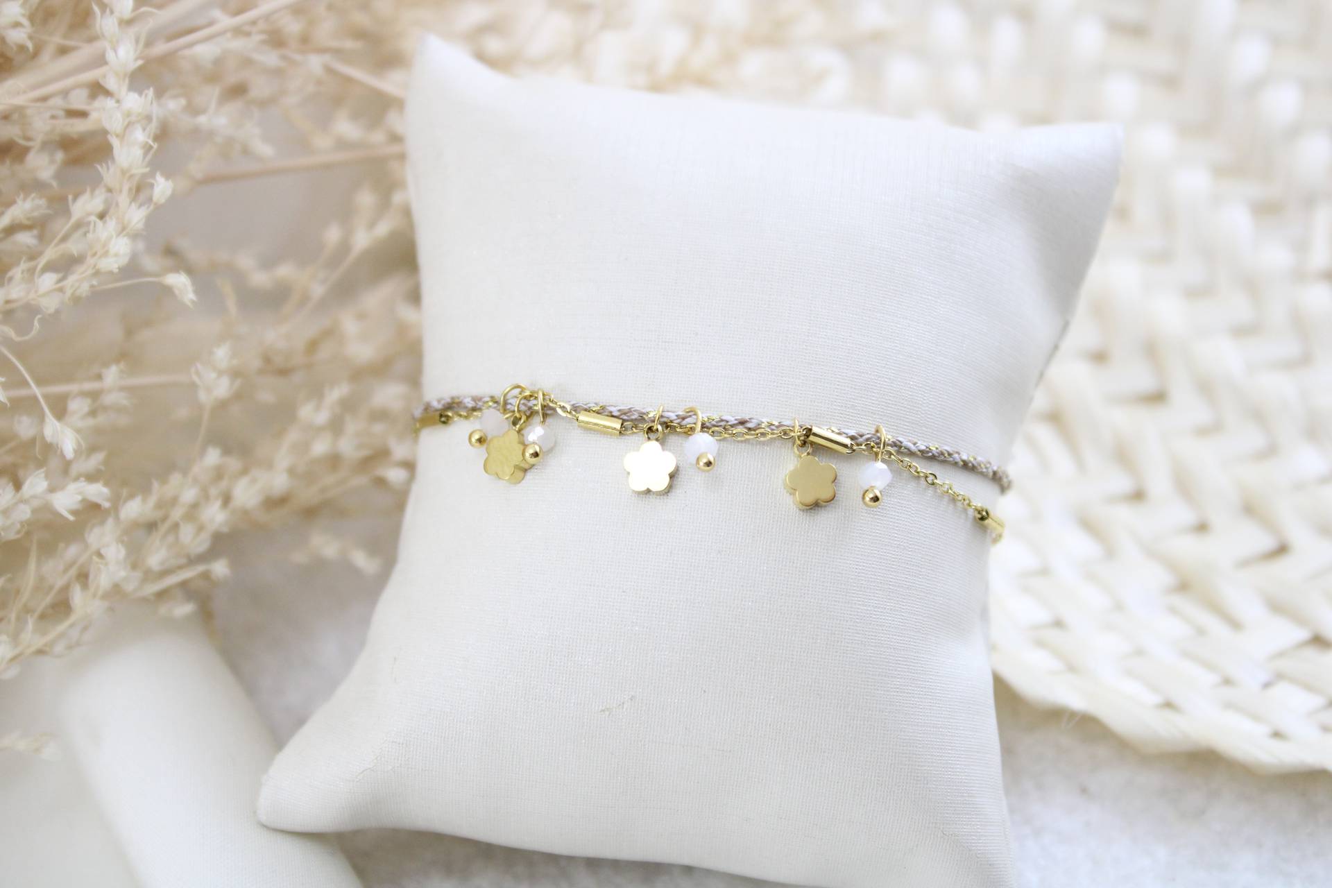 צמיד כפול בשילוב חוט חום ופרחים חומר גלם: סטיינלס סטיל בציפוי זהב