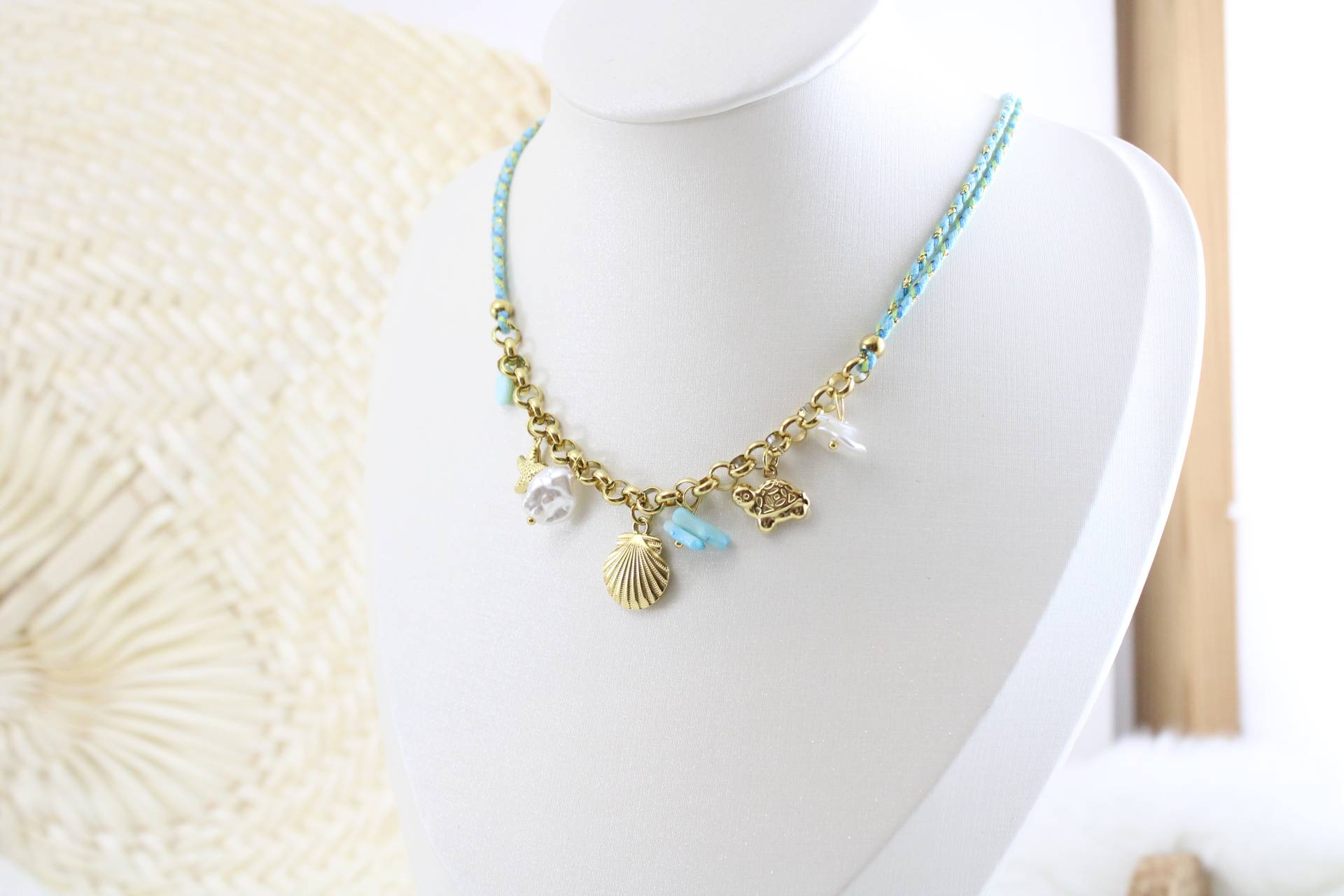 שרשרת חבל טורקיז בשילוב תליוני צדף פנינים וכוכב ים